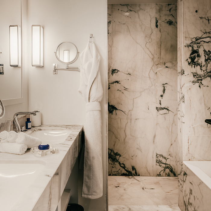 Découvrez notre nouvelle Suite Signature Duplex face à la mer disposant de son propre hammam privatif. Cette suite exclusive comprend également un toit-terrasse de 60m², un jardinet et un balcon. Située entre le bâtiment historique et l’extension de l’hôtel, la suite Signature Duplex présente une forme arrondie spectaculaire à chaque étage et revêt un habile mélange de matériaux entre parquet noble et pierre calcaire.